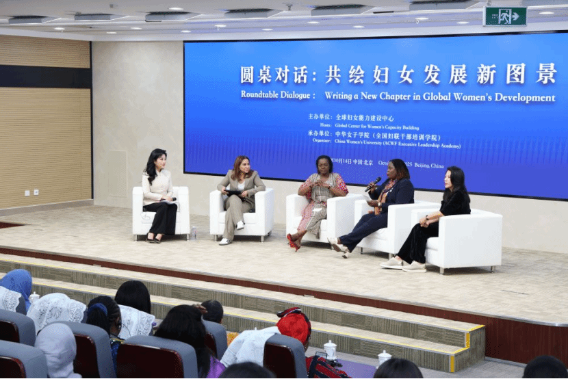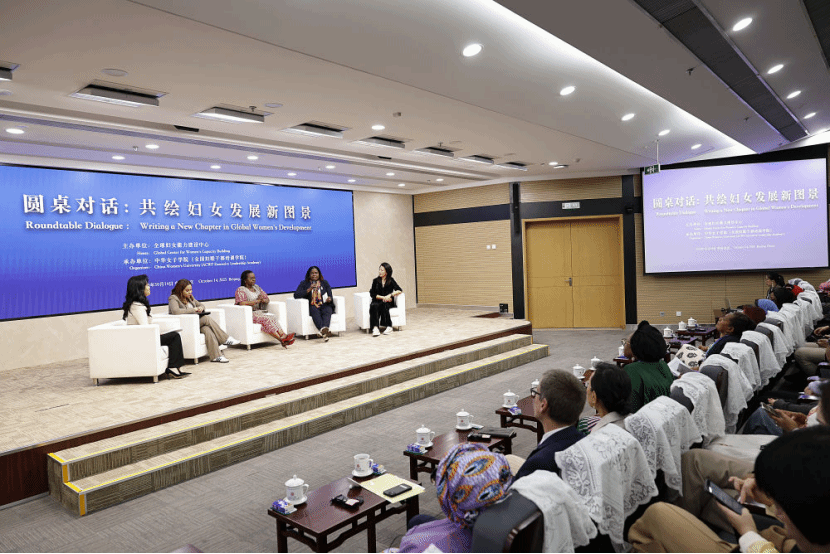 ↑ 10月14日,与会嘉宾在“全球妇女能力建设中心”揭牌仪式后进行圆桌对话。